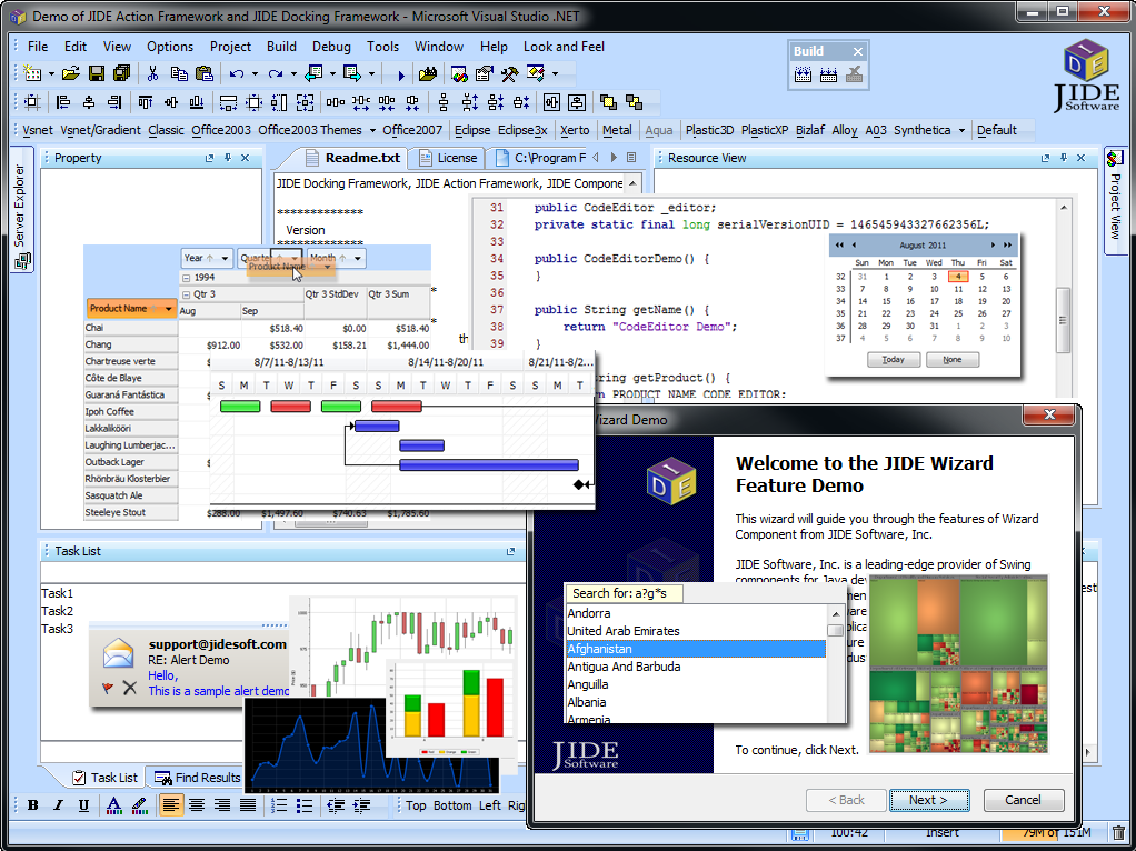 方案的产品目前包括JIDE桌面应用框架。JIDE桌面应用框架(JDAF)是一个真正的跨平台的Java桌面应用程序开发的基础。 大家都知道,Java开发出来的桌面应用程序各种各样,完全没有标准可循,而且还要支持各种操作系统,更增加了程序的复杂度。JDAF提供行业内第一个基于操作系统习惯的应用程序框架。从开发员的角度来看,用户界面的框架部分完全在掌控之中,因此,所有您需要做的的是创建内容和管理框架的窗口,对话框,菜单和工具栏。 MVC架构有利于用户界面和数据绑定。从用户的角度来看,产品将符合他们对操作系统的准则规范的应用经验部分原生和他们的平台上直观的应用程序感觉。该产品还为我们提供了一个平台,在未来推出新的和更专业的应用程序框架和附加类型。